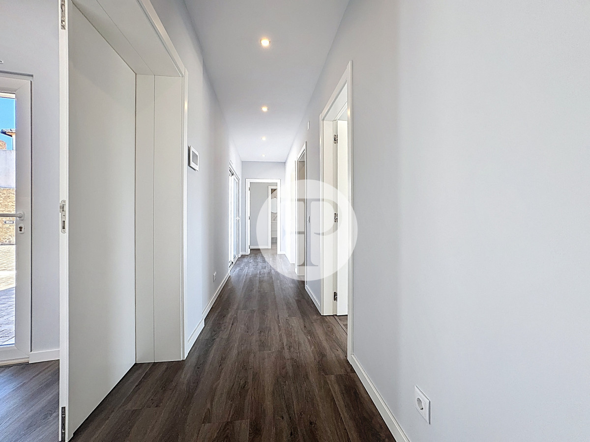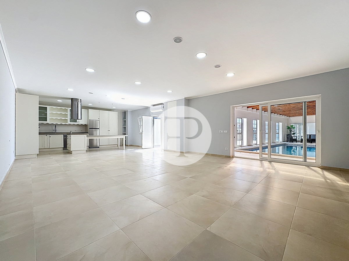 A transição entre a zona privada e a zona social é feita através de um corredor que inclui uma casa de banho completa de apoio e uma sala totalmente envidraçada, com relação direta com a piscina — um dos espaços mais distintivos da casa.