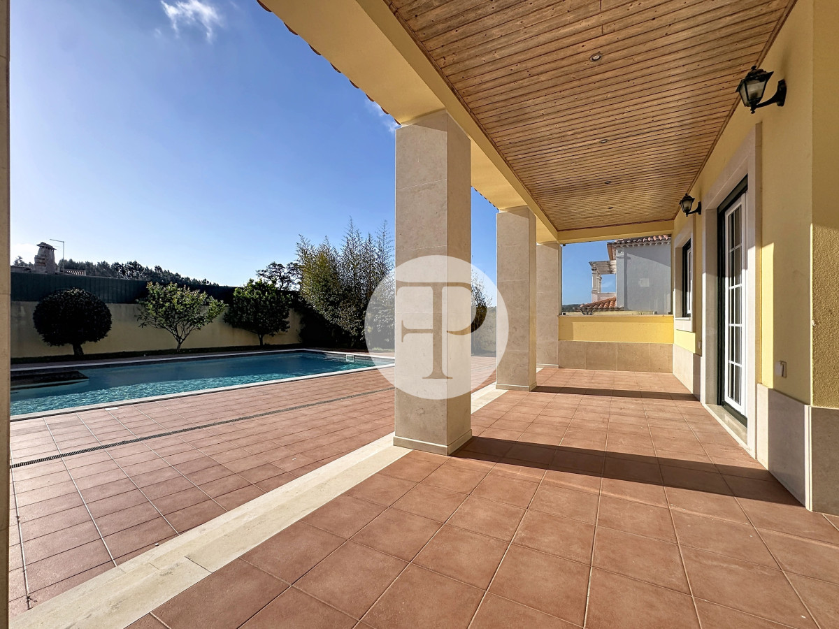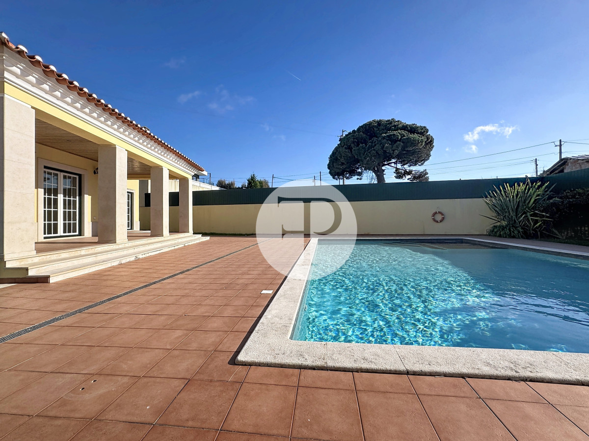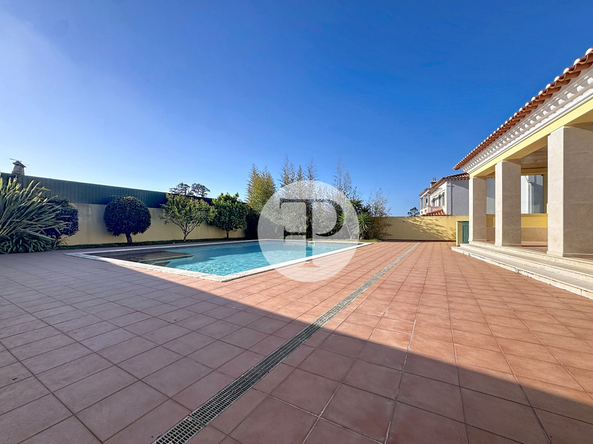 A piscina, com excelente exposição solar, é complementada por terraços amplos, jardim e zona de churrasqueira, criando um ambiente pensado para lazer e privacidade.