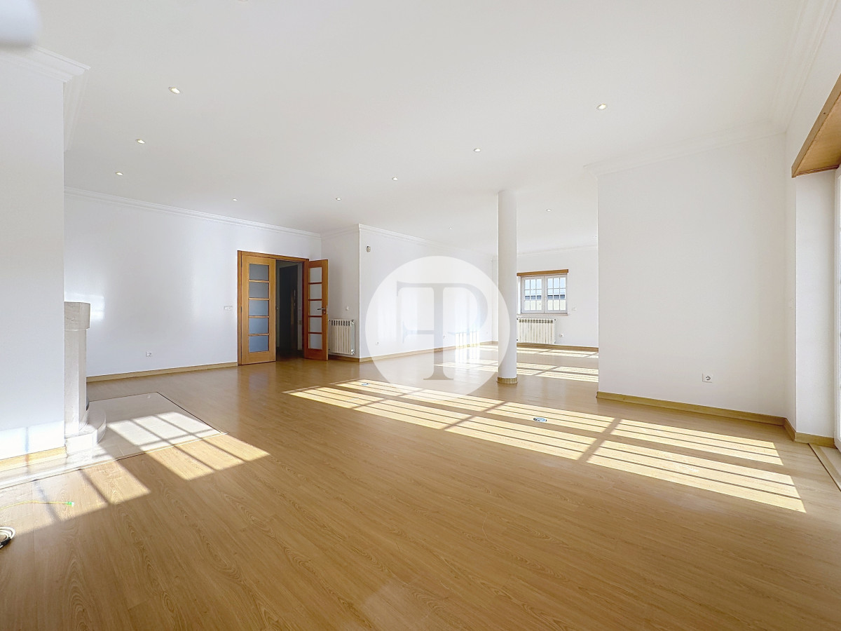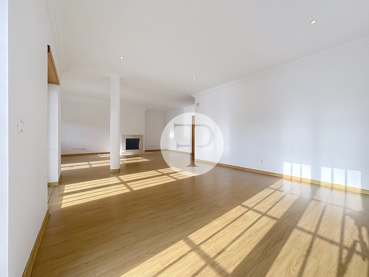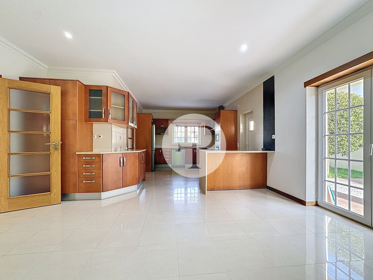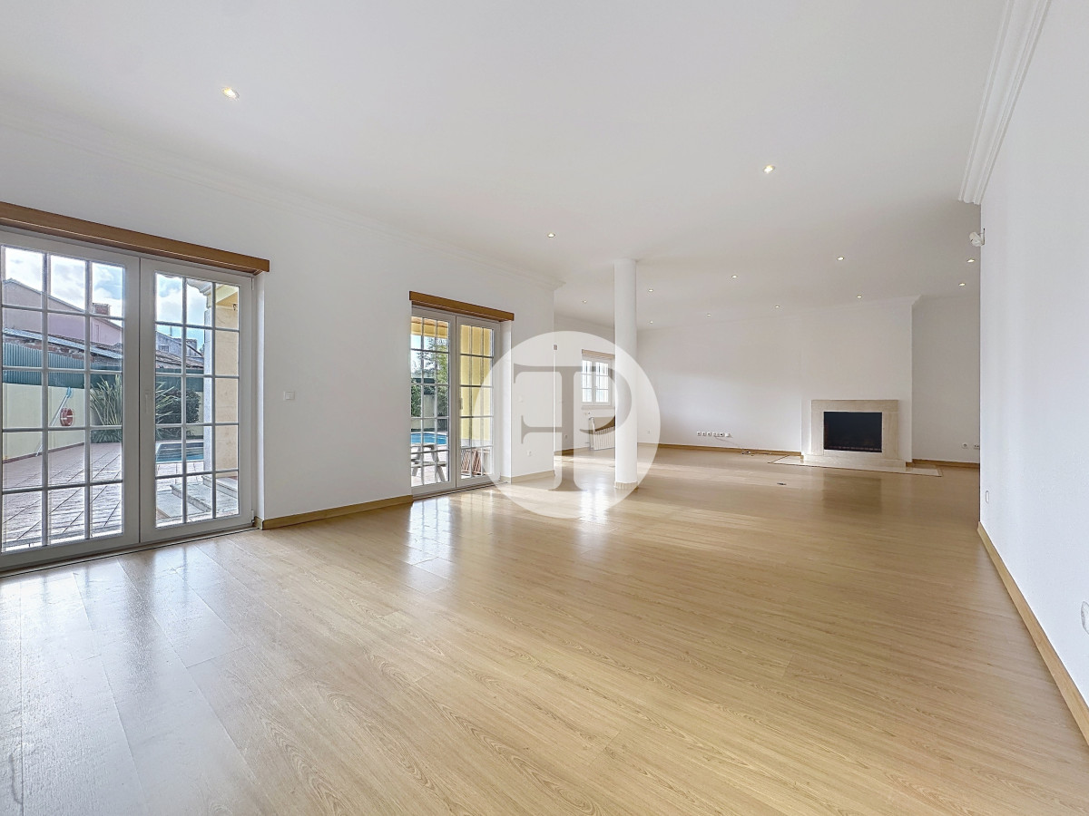 A zona social apresenta-se ampla e luminosa, com uma sala de estar com lareira que se prolonga naturalmente para o exterior, criando uma ligação direta ao jardim e à piscina.