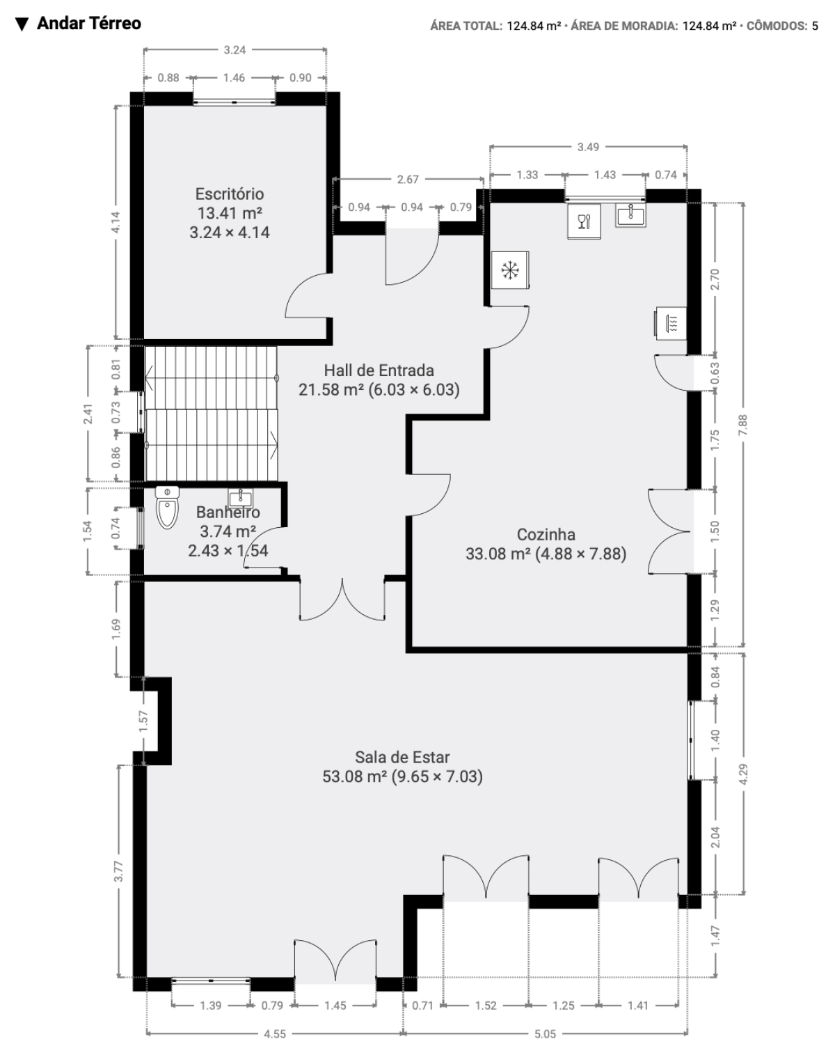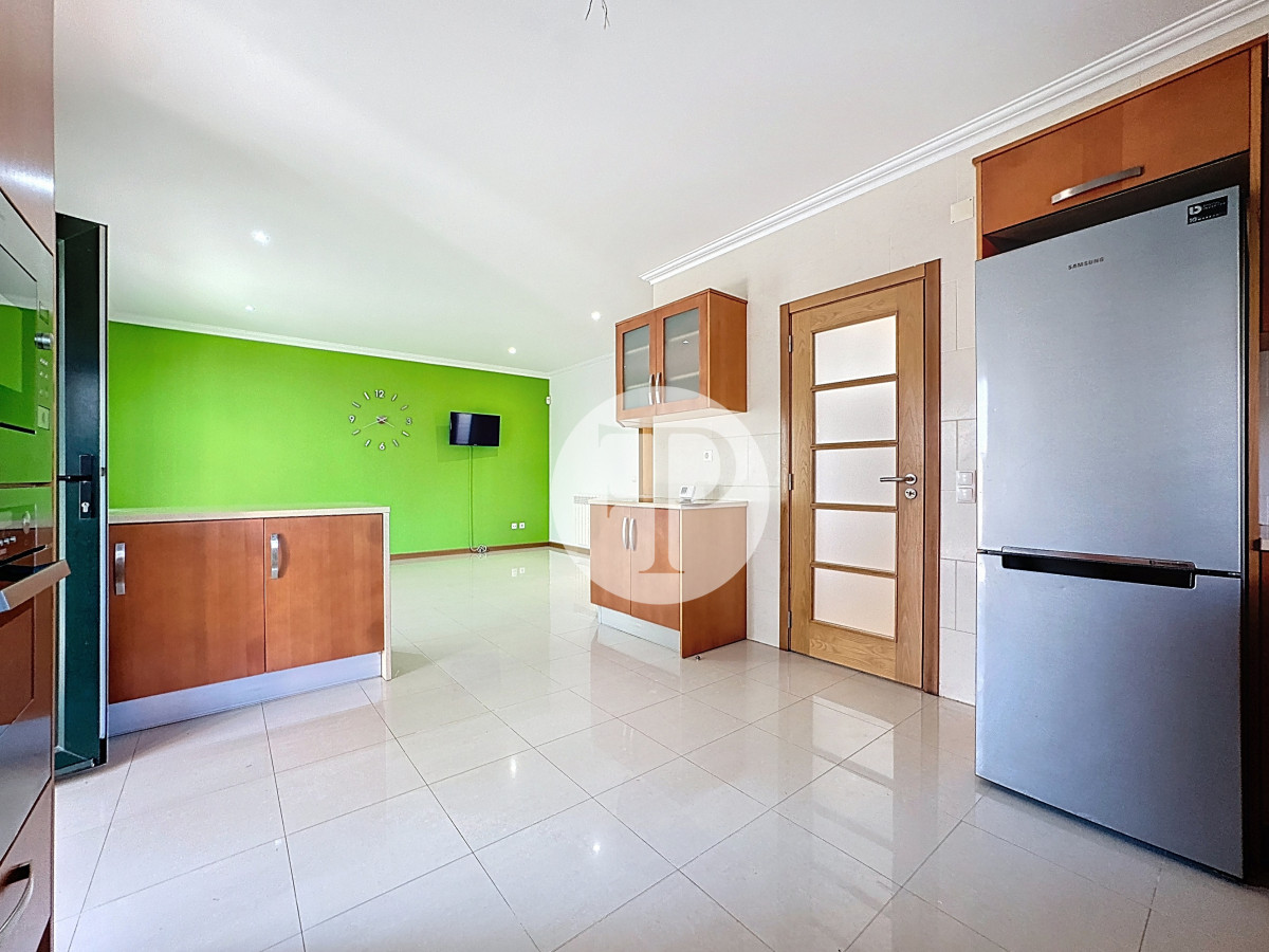 A cozinha, com acesso ao exterior, integra-se de forma funcional no conjunto, sendo apoiada por um escritório (ou quarto) e uma wc social.