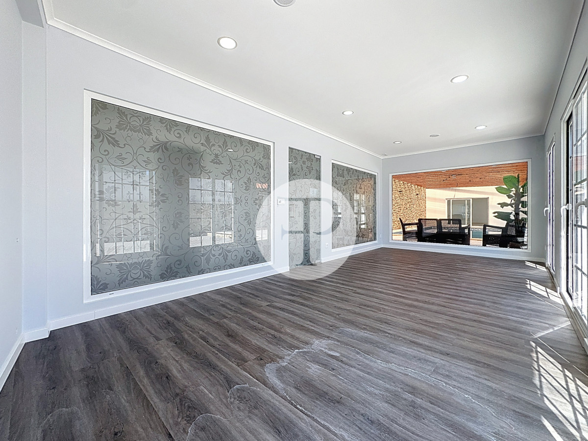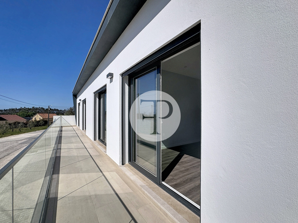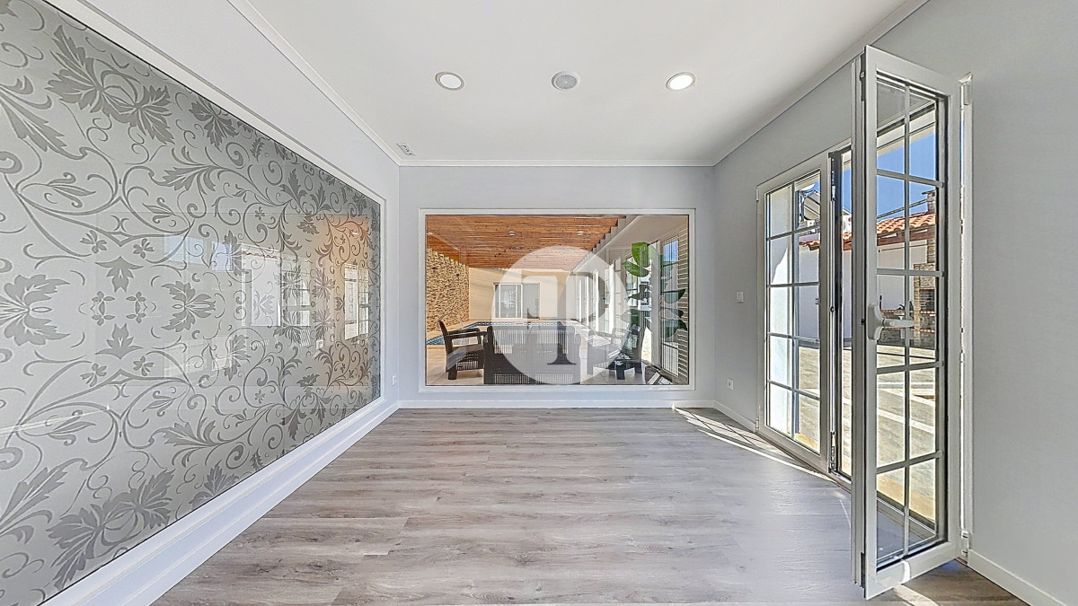 A transição entre a zona privada e a zona social é feita através de um corredor que inclui uma casa de banho completa de apoio e uma sala totalmente envidraçada, com relação direta com a piscina — um dos espaços mais distintivos da casa.