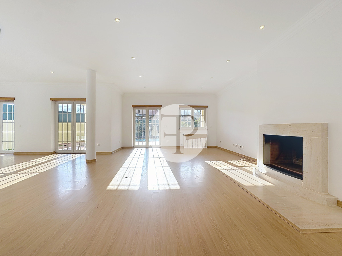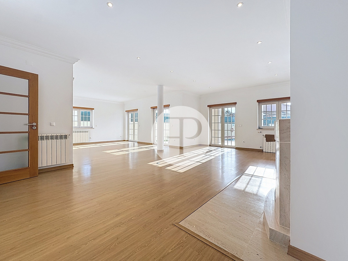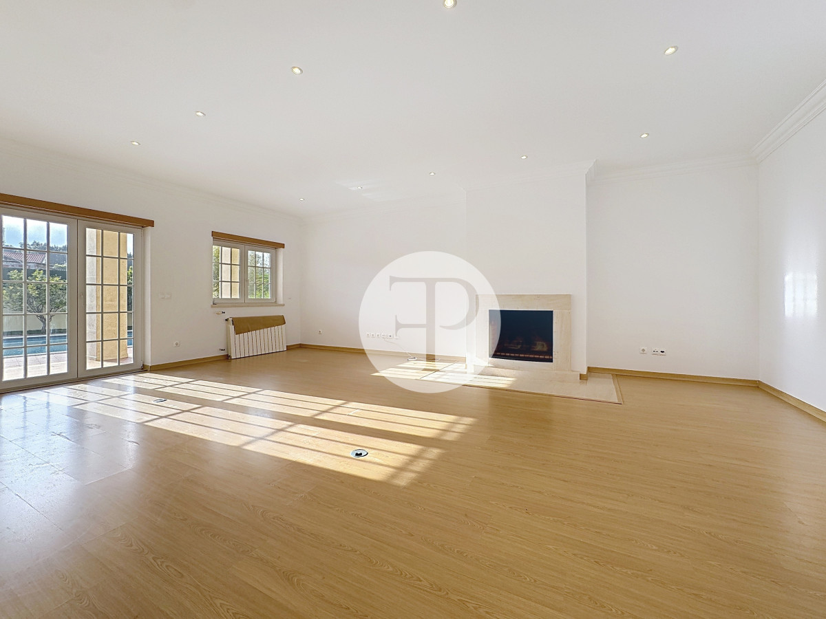 A zona social apresenta-se ampla e luminosa, com uma sala de estar com lareira que se prolonga naturalmente para o exterior, criando uma ligação direta ao jardim e à piscina.