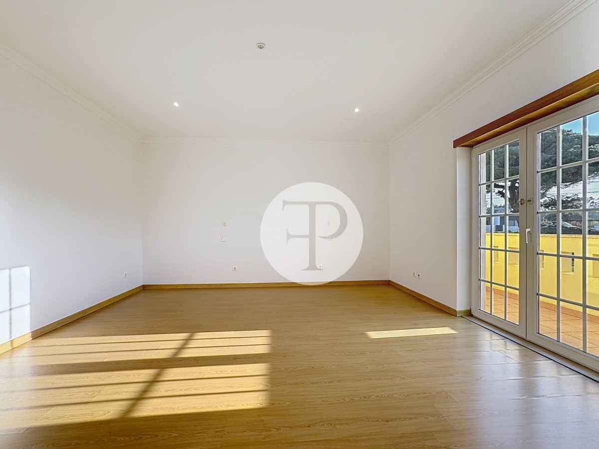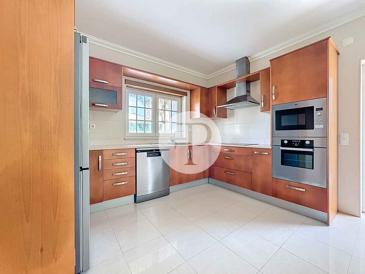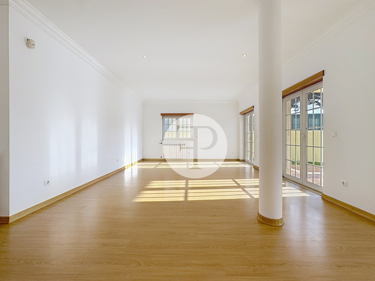 A zona social apresenta-se ampla e luminosa, com uma sala de estar com lareira que se prolonga naturalmente para o exterior, criando uma ligação direta ao jardim e à piscina.